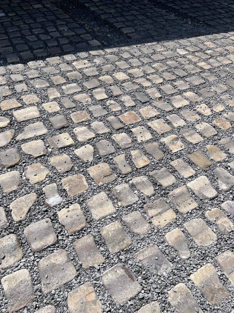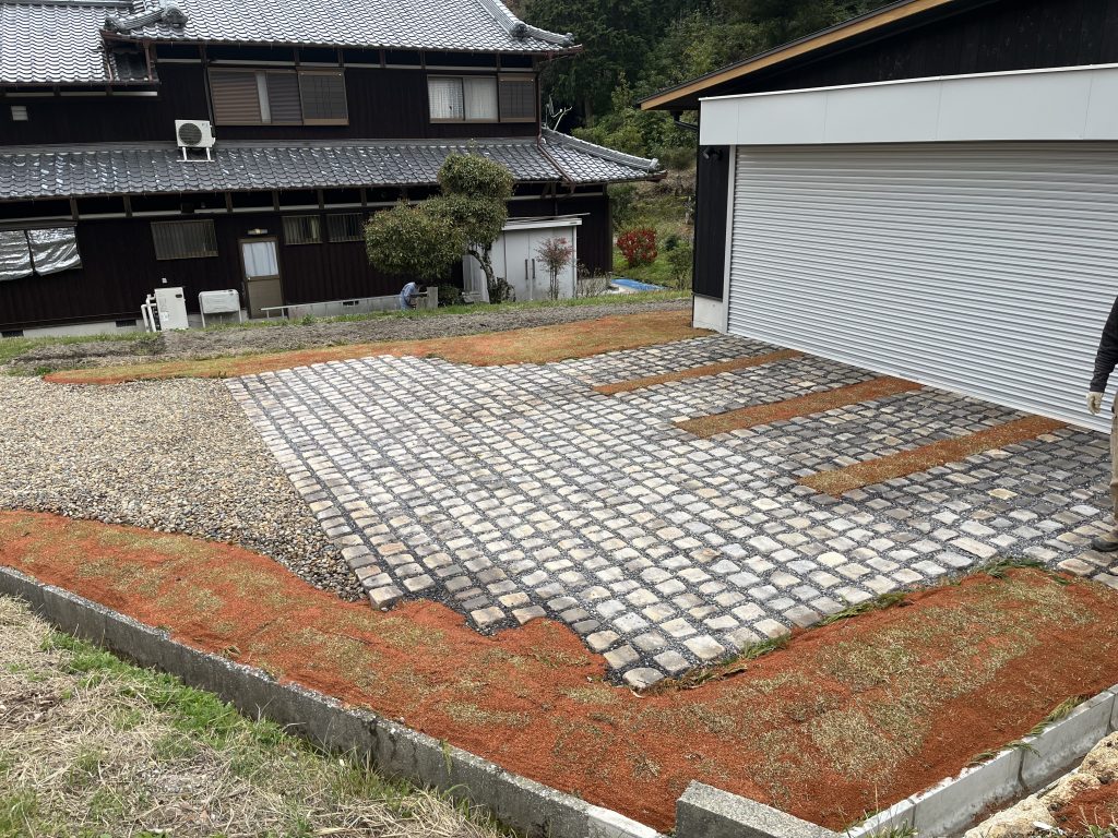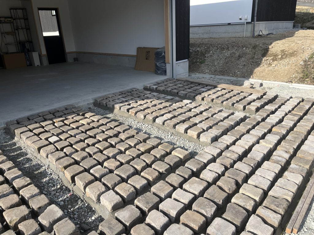 上の写真は、車が乗る部分の地面に使った資材の写真です。一見石に見えるかもしれませんが、これは、溶鉱炉でつかわれていたらしい耐火煉瓦の再利用品です。