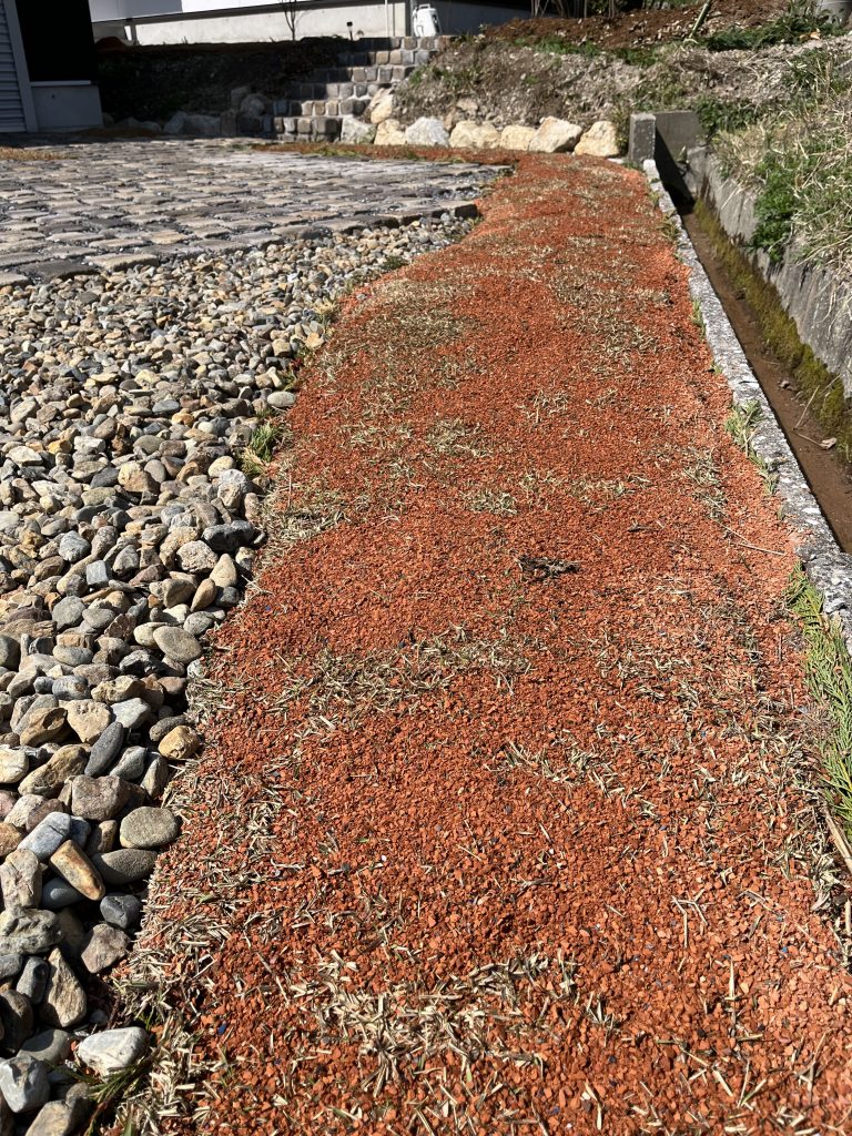 先程の瓦の小石粒大のとのは、和瓦の砕いたもので、上の写真の赤い部分に使っているのは、洋瓦の砕いたものの、砂粒大のものです。先程、植物の生育をよくする目的で植栽基盤の改良材として使われていると申しましたが、こちらでは、同じ理由で、芝生の目土として使ってます。多孔質なので水分も含み、空気も含み、微生物の居場所にもなると考えられます。芝生の目土としても、おそらく悪くないと判断して、今回初めてその用途で使いました。