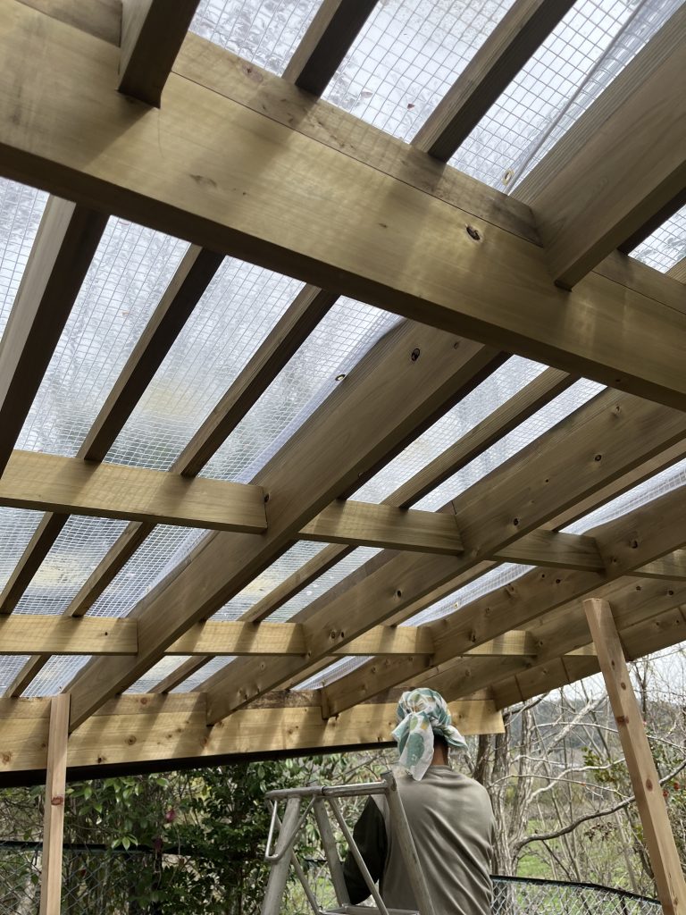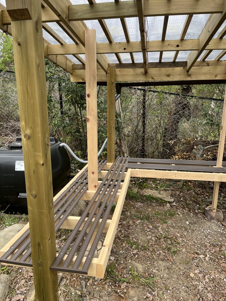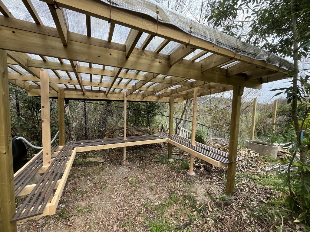 上の写真が、苗置き場の様子です。屋根には、光を通す透明なビニルのテントを使ってとても軽やかな仕上がりになりました^_^