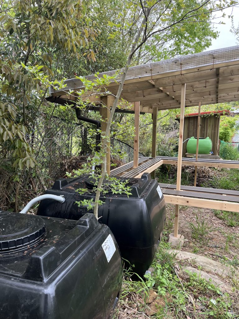 この広っぱには、水道も電気も来ていないために、水は雨水を利用したいところです。テントの屋根に樋を設け、樋にタンクを繋いで、雨水を溜めるようにしています。このブログでも、過去に紹介させてもらったこともありますが、今回も、この場所に2台のたタンクを設置しました。