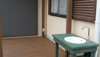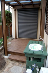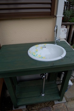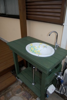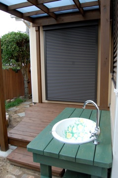こちらは、流し台です。ボウルには柄が描かれていますが、この柄も何種類か有りますのでお好みにあわせて選んで頂けます。(無地も有ります。)台自体は木製です。今回はデッキの色と違う色を塗る事で少しアクセントがついたのではないかとおもいます。こういった「小物」(例えば木戸なども)の色を選ぶ時にはベーシックな色(茶系など)ではなく、カラフルな色を塗るのも面白いかもしれません。塗る面積が小さいのでお庭のアクセントにする事ができます。