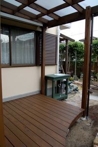 明日には、ベンチを2台作成し設置すれば完成です。お客様には「もう一つお部屋が出来た感じ」と喜んで頂いております。家庭菜園でとれたトマトなどの野菜などをここで洗って丸かぶり。なんて事もできそうです。(ちょっと季節が違いましたね。トマトは来年のお楽しみです。なんなら、冬野菜のほうれん草の丸かぶり、は無理矢理ですね。)